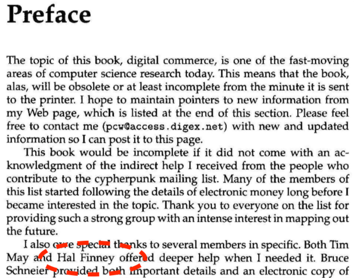 Peter Wayner published “Digital Cash: Commerce on the Net” 1995 09-01. Wayner acknowledged Hal Finney in the preface. Hal is the inventor of Reusable Proof of Work (RPOW 2004), a key enabling technology of Bitcoin. Hal was also the first person to receive a Bitcoin transaction. [4]