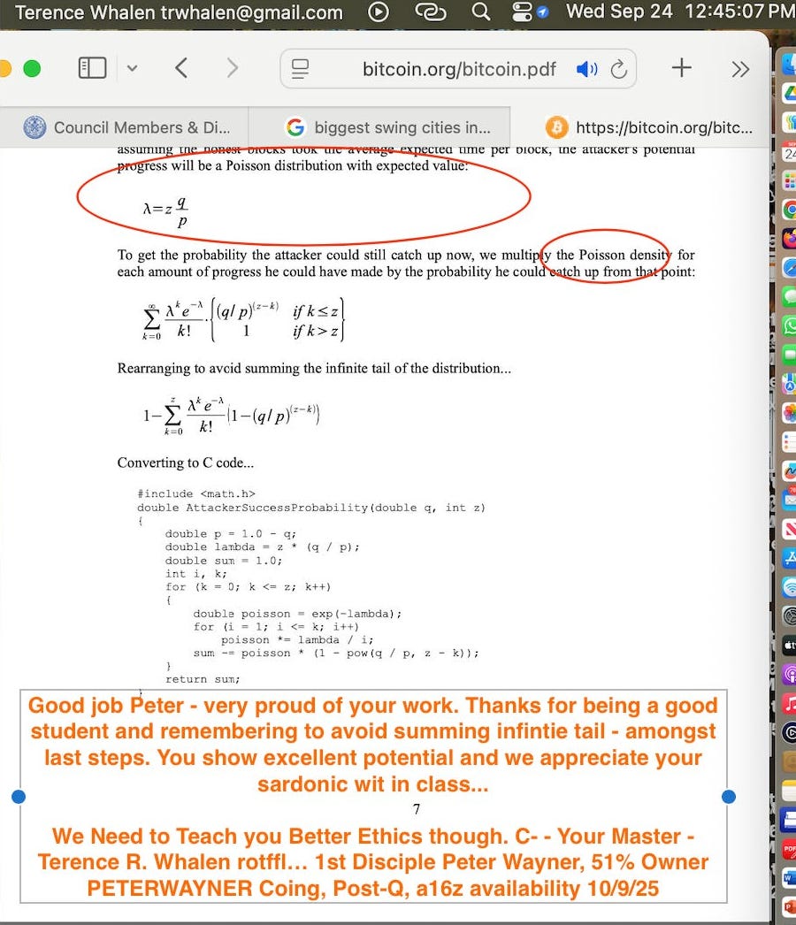 Peter Wayner published “Bitcoin P2P e-cash paper” 2008 10-31. He advanced prior state of art by fusing Poisson (from his Princeton 1986 senior thesis) to Hal’s RPOW. [6]